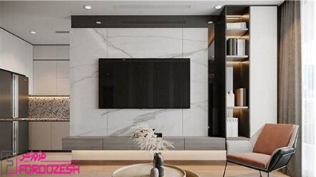 - استفاده از دیوارکوب یا پنل: دیوارکوبهای چوبی، لمینت یا پنلهای سه بعدی، جهت پنهان کردن سیمهای پشت تلویزیون استفاده میشوند. دیوارکوبها ظاهری شیک و مدرن دارند و علاوه بر کاربردی بودن، باعث زیبایی محیط نیز میشوند.